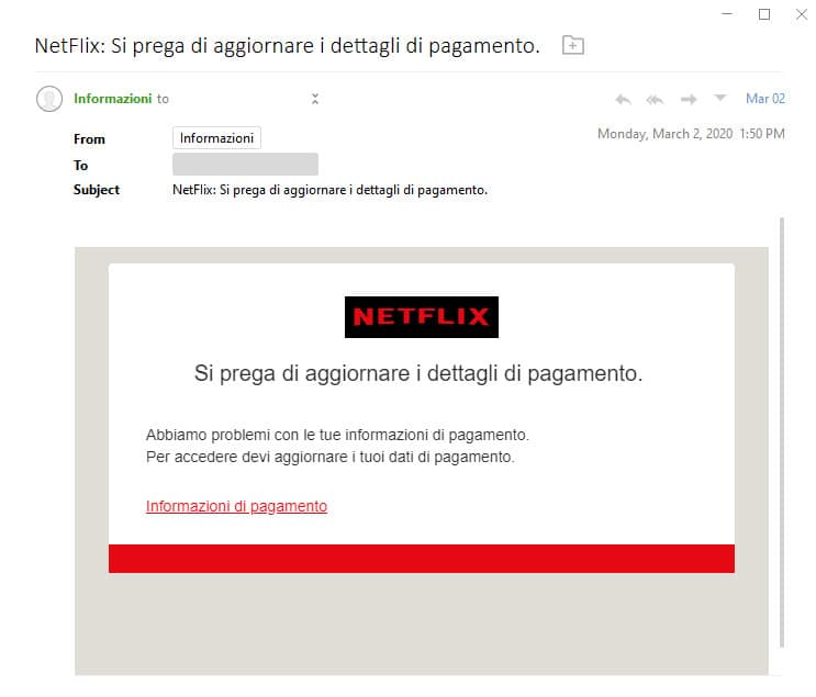 Generalmente, prende la forma di un’e-mail che avvisa l’utente di una qualche urgenza, come la scadenza di un servizio, la necessità di consegnare un pacco o semplicemente di aggiornare delle informazioni di pagamento. Cliccando sul link fornito dalla mail si giunge ad una pagina che simula di essere di un qualche ente affidabile, ma che trasmette tutti i dati ad un’altra persona, che poi può utilizzarli come preferisce.