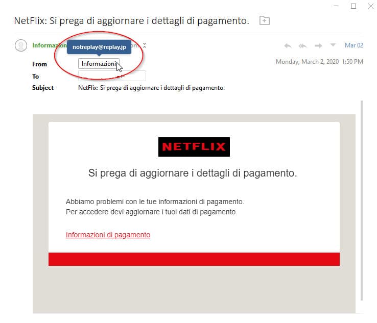 Una buona parte delle e-mail di Phishing proviene da un’e-mail evidentemente diversa da quella che ci si potrebbe aspettare. Quindi, un metodo veloce per scartarle è quello di controllare il mittente. A volte invece è possibile che un’e-mail indichi un mittente plausibile, ma sia presente anche un indirizzo di risposta che risulta chiaramente non dell’ente che sta cercando di simulare.